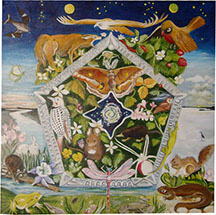 I drew this in colored pencil when I moved to Camano Island. It shows many of the plants and animals encountered at Rocky Point Gardens, and on the five acres at Tara Lane off West Camano Drive. Many years later I found a perfect canvas, so I painted the Pentagram in acrylics.